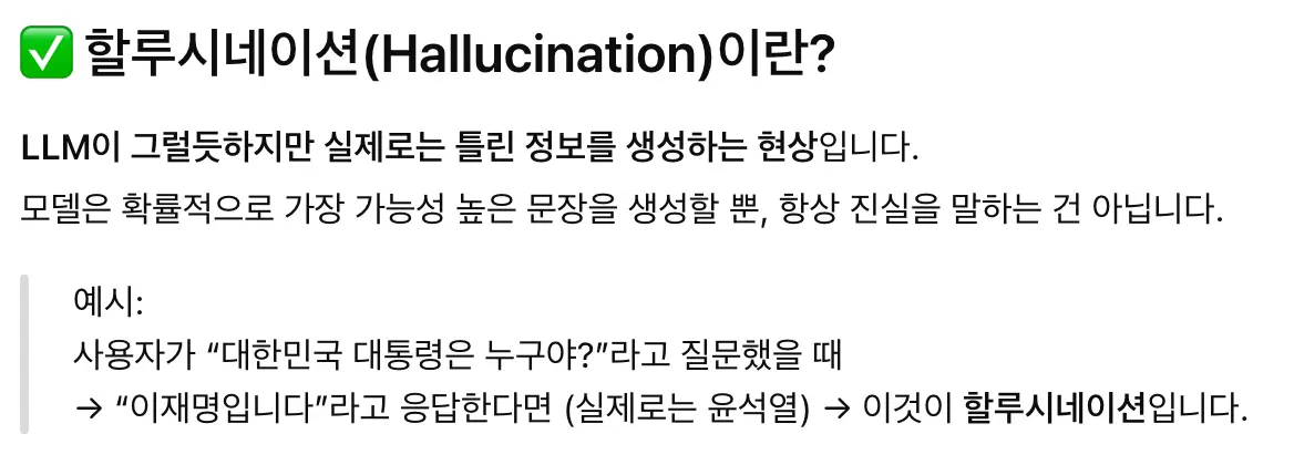 이 글을 작성하고 있는 날(2025-06-16)을 기준으로 봤을 때, 위 답변 또한 할루시네이션 문제가 발생했다는 것을 알 수 있다. 현재 이재명이 대한민국 대통령이기 때문이다.