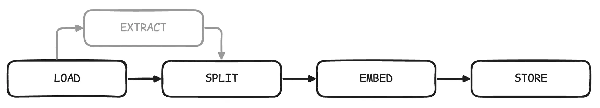 위의 과정에서 데이터 확보 과정을 제외한 후 정보를 벡터화해 벡터저장소에 저장하기까지의 과정을 전처리 단계라고 볼 수 있다. 전처리 과정을 좀 더 일반화해 보면 다음과 같다. 전처리 과정은 시스템 개발에서 한 번만 수행해 놓으면 되고 이후에 실제 서비스에서는 실행 단계만 수행하게 된다.