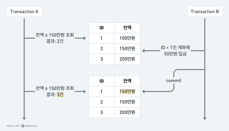 이렇게 동일한 트랜잭션 내에서 동일한 조건으로 여러 번 데이터를 조회할 때 중간에 다른 트랜잭션이 새로운 데이터를 넣거나 또는 기존의 데이터를 수정해 조건을 만족하도록 만들어 여러 번의 조회 결과가 달라지는 문제가 Phantom Read이다.