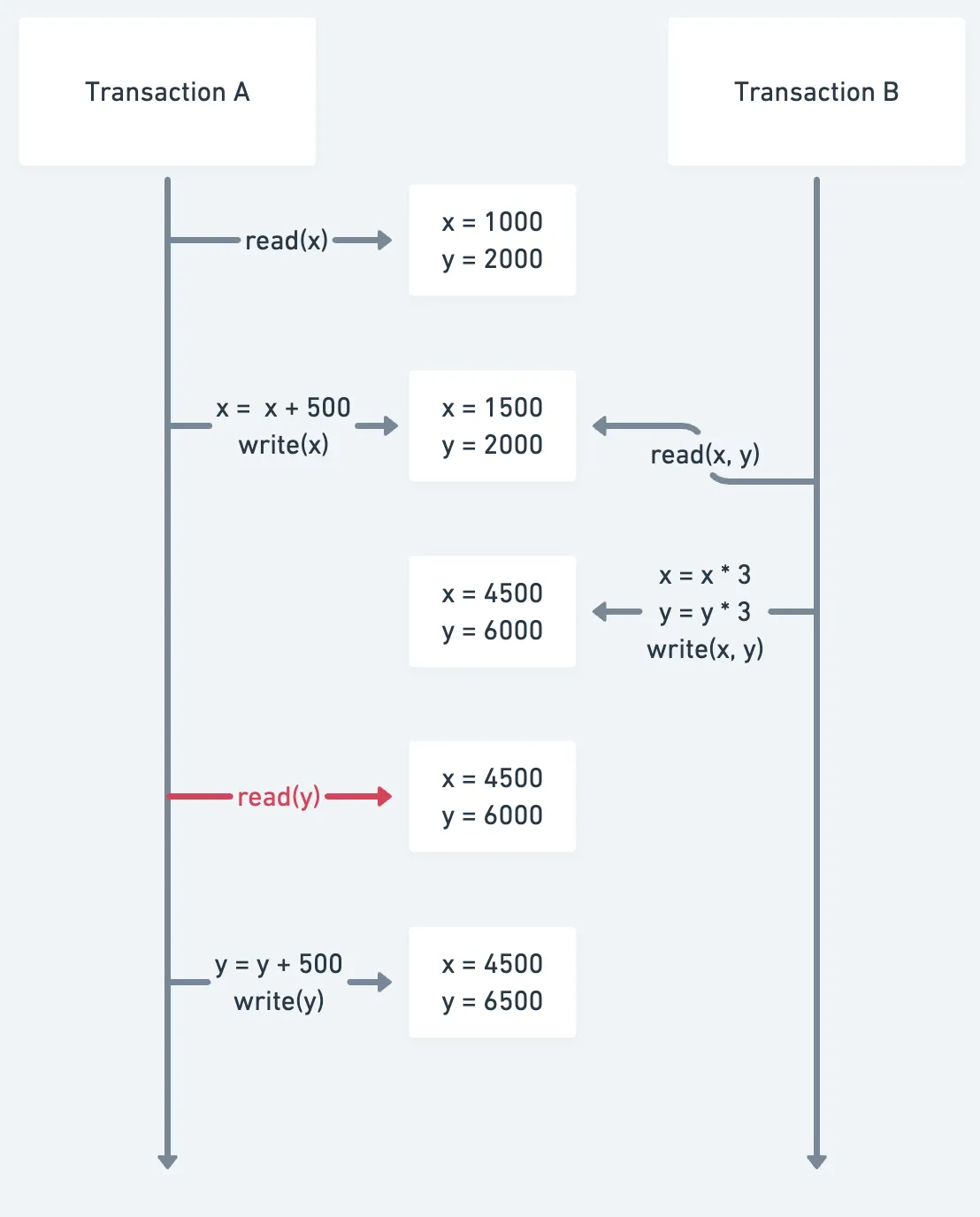 그리고 트랜잭션 A의 `x + 500` 연산 이후 트랜잭션 B의 `x * 3` 연산과 `y * 3` 연산이 수행된 다음에 마지막으로 트랜잭션 A의 `y + 500` 연산이 이루어진다.