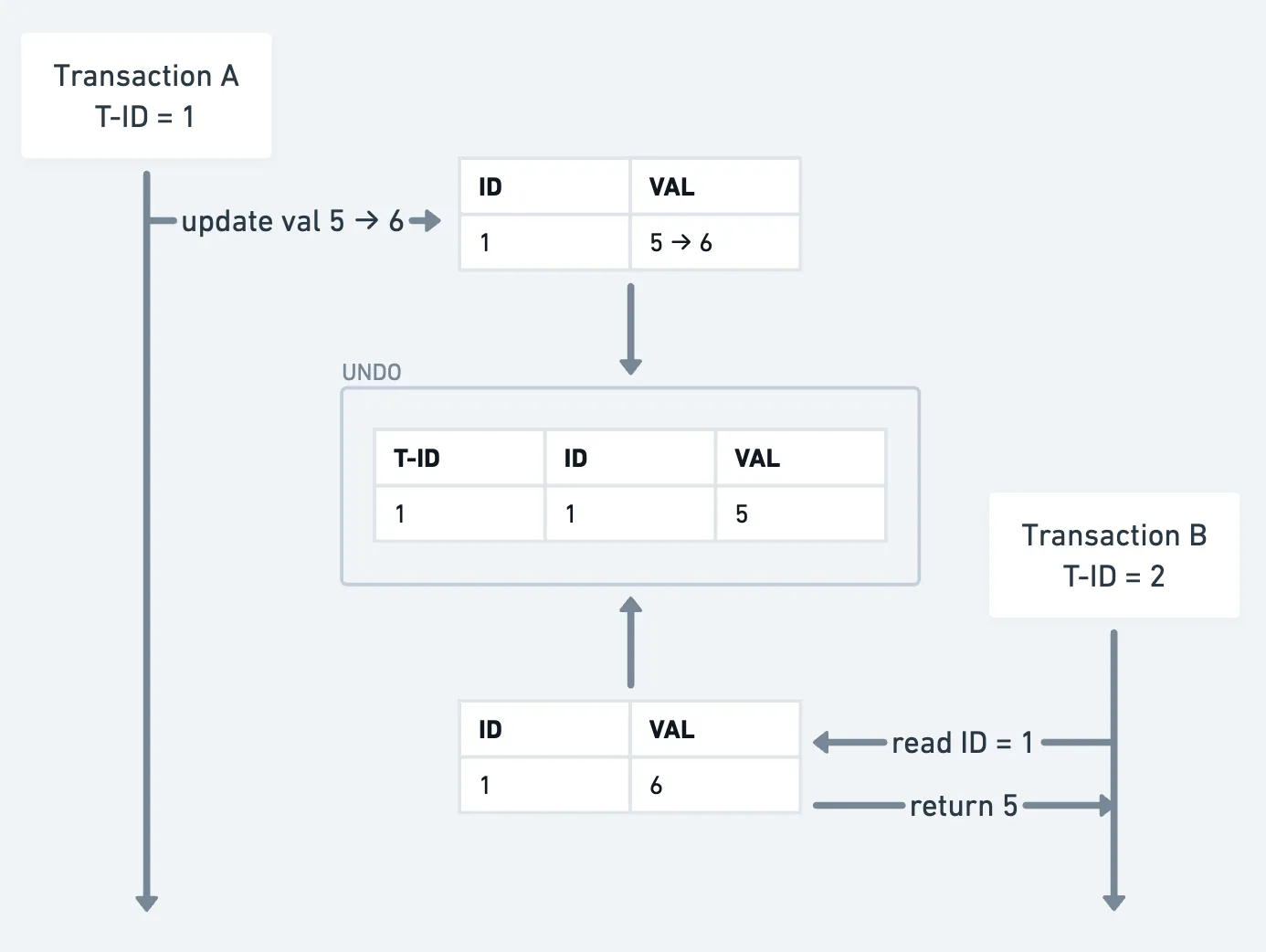 - 데이터베이스 엔진이 UNDO 로그를 참조해 T-B가 읽는 버전에 맞게 재구성한 결과 5를 반환한다.