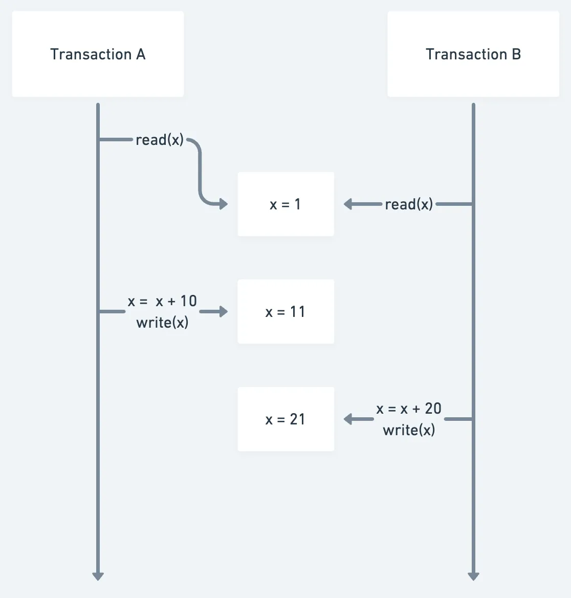 두 트랜잭션이 직렬로 실행되었다면 `x` 값은 31이 되어야 한다. 하지만 트랜잭션 A가 `x`의 값을 갱신하고 커밋하기 전에 트랜잭션 B가 `x`의 값을 읽기 때문에 그 값을 1로 읽게 되어 1에 20을 더한 21로 갱신하게 된다. 결과적으로 `x`의 값이 31이 아닌 21로 갱신되는 것이다.