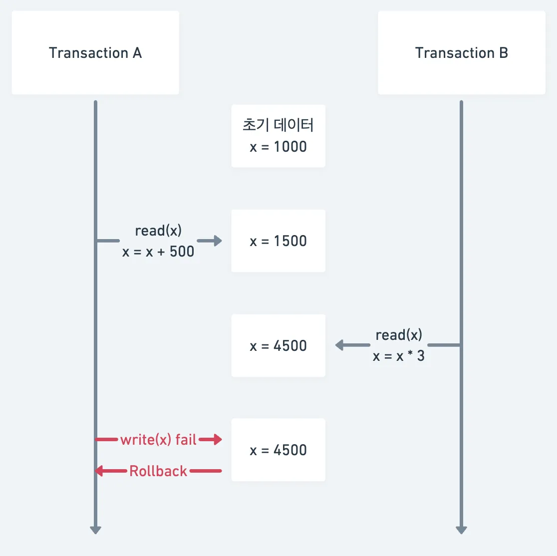 - 트랜잭션 A : 바뀐 값을 저장하는데 실패해 롤백한다.
